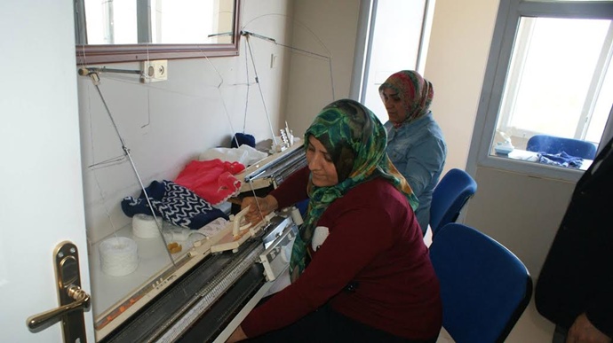 Bu kapsamda öğrencilere dağıtılmak üzere bere, atkı, triko kazak, etek, yelek benzeri giysilerin üretimine başlandı.