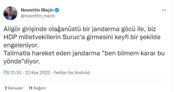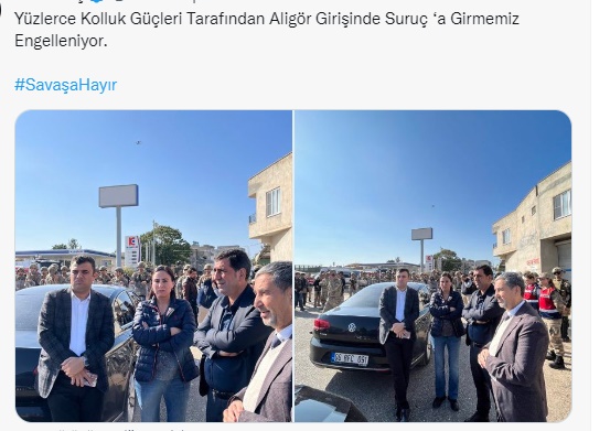 Fakat jandarma tarafından izin verilmedi. Şanlıurfa Valiliği’nce kent merkezi ve ilçelerinde 15 günlük basın açıklaması, miting, yürüyüş yapılmamasına yönelik yasaklama kararı aktarıldı Alınan yoğun güvenlik önlemine ve ilçeye girişlerine izin verilmemesine HDP'liler tepki gösterdi.