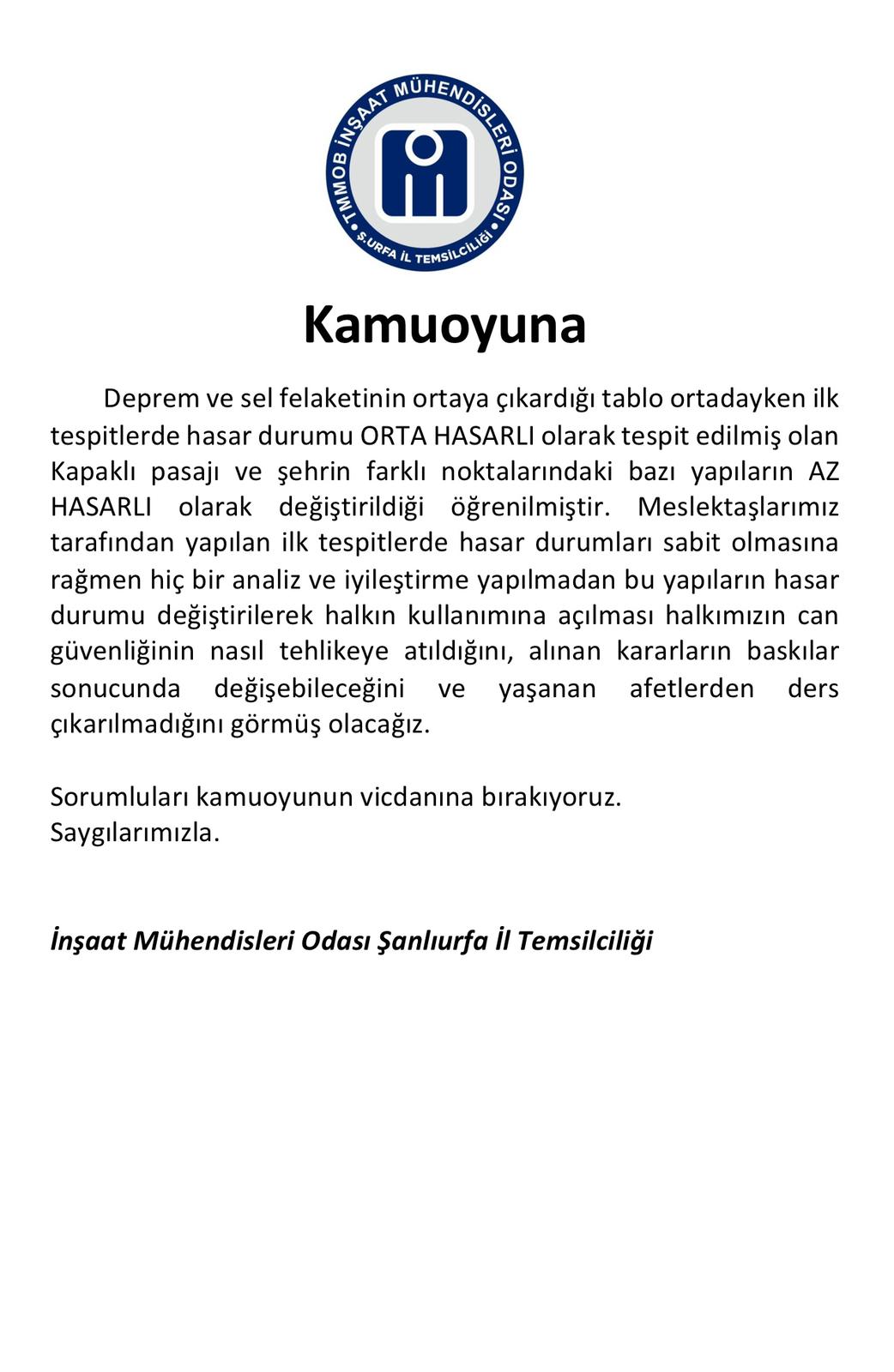 İMO Şanlıurfa İl Temsilciliği'nin yaptığı açıklama şöyle;"Deprem ve sel felaketinin ortaya çıkardığı tablo ortadayken ilk tespitlerde hasar durumu ORTA HASARLI olarak tespit edilmiş olan Kapaklı pasajı ve şehrin farklı noktalarındaki bazı yapıların AZ HASARLI olarak değiştirildiği öğrenilmiştir. Meslektaşlarımız tarafından yapılan ilk tespitlerde hasar durumları sabit olmasına rağmen hiç bir analiz ve iyileştirme yapılmadan bu yapıların hasar durumu değiştirilerek halkın kullanımına açılması halkımızın can güvenliğinin nasıl tehlikeye atıldığını, alınan kararların baskılar sonucunda değişebileceğini ve yaşanan çıkarılmadığını görmüş olacağız. afetlerden ders