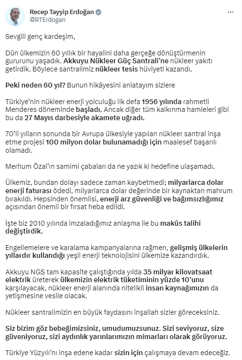 “Sevgili genç kardeşim, dün ülkemizin 60 yıllık bir hayalini daha gerçeğe dönüştürmenin gururunu yaşadık. Akkuyu Nükleer Güç Santrali’ne nükleer yakıtı getirdik. Böylece santralimiz nükleer tesis hüviyeti kazandı. Peki neden 60 yıl? Bunun hikayesini anlatayım sizlere. Türkiye’nin nükleer enerji yolculuğu ilk defa 1956 yılında rahmetli Menderes döneminde başladı. Ancak diğer tüm kalkınma hamleleri gibi bu da 27 Mayıs darbesiyle akamete uğradı. 70’li yılların sonunda bir Avrupa ülkesiyle yapılan nükleer santral inşa etme projesi 100 milyon dolar bulunamadığı için maalesef başarılı olamadı. Merhum Özal’ın samimi çabaları da ne yazık ki hedefine ulaşamadı.