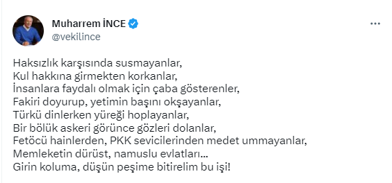 İnce, açıklamasında,? “Haksızlık karşısında susmayanlar, kul hakkına girmekten korkanlar, insanlara faydalı olmak için çaba gösterenler, fakiri doyurup, yetimin başını okşayanlar, Türkü dinlerken yüreği hoplayanlar, bir bölük askeri görünce gözleri dolanlar, FETÖ’cü hainlerden, PKK sevicilerinden medet ummayanlar, memleketin dürüst, namuslu evlatları. Girin koluma, düşün peşime bitirelim bu işi.” ifadelerine yer verdi.