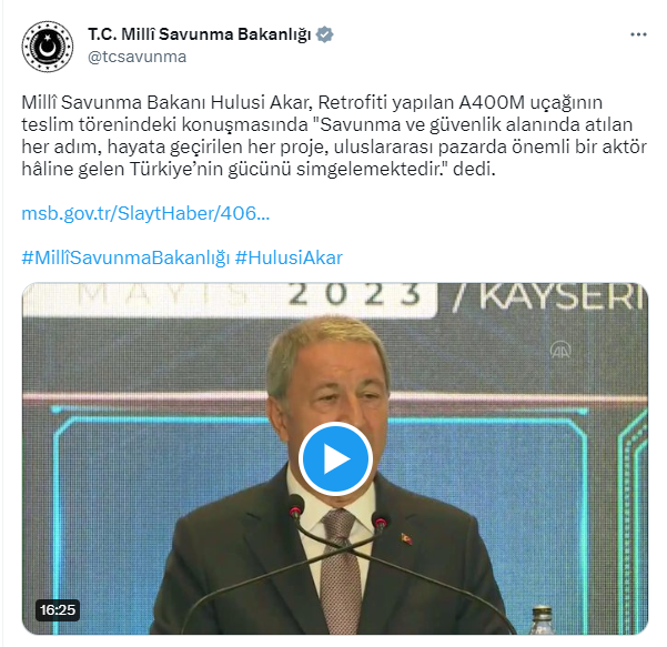 Bakanlığın sosyal medya hesabından yapılan açıklamaya göre, Milli Savunma Bakanı Hulusi Akar, ?retrofiti yapılan A400M uçağının teslim törenindeki konuşmasında “Savunma ve güvenlik alanında atılan her adım, hayata geçirilen her proje, uluslararası pazarda önemli bir aktör haline gelen Türkiye’nin gücünü simgelemektedir." dedi.