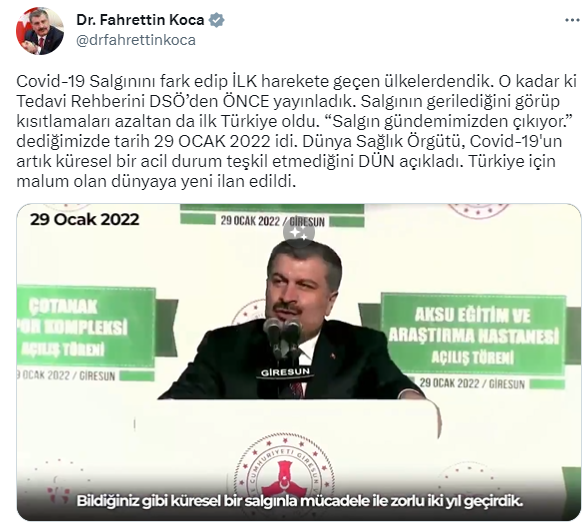 Bakan Koca sosyal medya hesabından yaptığı a?ıklamada, "Covid-19 Salgınını fark edip İLK harekete ge?en ?lkelerdendik. O kadar ki Tedavi Rehberini DS?’den ?nce yayınladık. Salgının gerilediğini g?r?p kısıtlamaları azaltan da ilk T?rkiye oldu. “Salgın g?ndemimizden ?ıkıyor.” dediğimizde tarih 29 Ocak 2022 idi. D?nya Sağlık ?rg?t?, Covid-19'un artık k?resel bir acil durum teşkil etmediğini d?n a?ıkladı. T?rkiye i?in malum olan d?nyaya yeni ilan edildi." ifadelerine yer verdi.