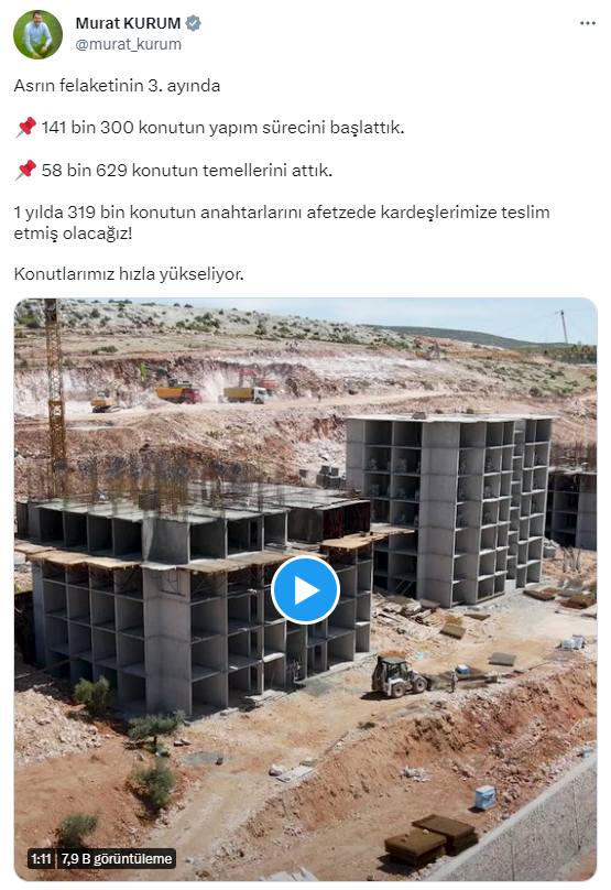 “Asrın felaketinin 3. ayında. 141 bin 300 konutun yapım s?recini başlattık. 58 bin 629 konutun temellerini attık. 1 yılda 319 bin konutun anahtarlarını afetzede kardeşlerimize teslim etmiş olacağız. Konutlarımız hızla y?kseliyor.”
