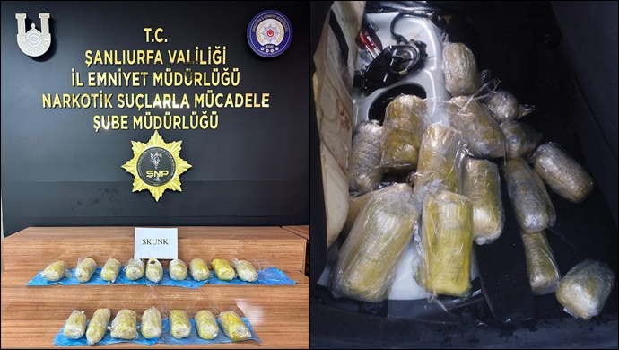 Şanlıurfa Valiliği'nden yapılan açıklamaya göre, Şanlıurfa İl Emniyet Müdürlüğü Narkotik Suçlarla Mücadele Şube Müdürlüğü ekiplerince gerçekleştirilen operasyon kapsamında durdurulan bir araçta yapılan aramada 16 paket halinde toplam 11 kilo 500 gram skunk adı verilen uyuşturucu madde ele geçirildi. Operasyon kapsamında 1 şüpheli şahıs gözaltına alındı. Şahıs hakkında "Uyuşturucu Madde Ticareti Yapmak ve Nakletmek" suçundan adli tahkikata başlanıldı.