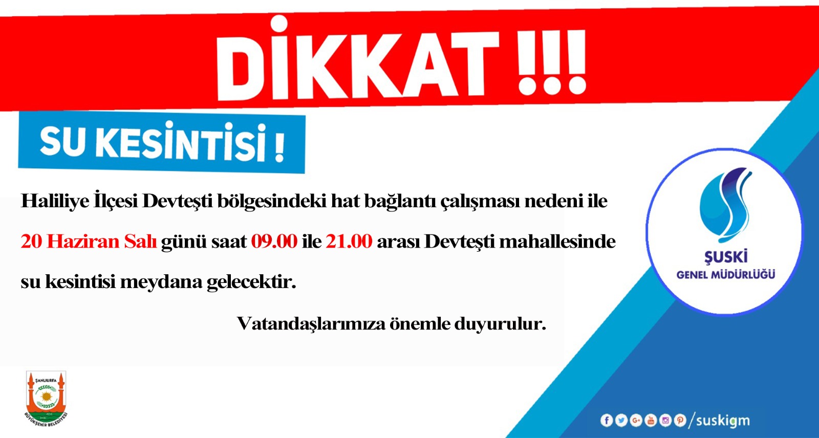 “Haliliye İlçesi Devteyşti bölgesindeki hat bağlantı çalışması nedeni ile 20 Haziran Salı günü saat 09.00 ile 21.00 arası Devteyşti mahallesinde su kesintisi meydana gelecektir.Vatandaşlarımıza önemle duyurulur.”
