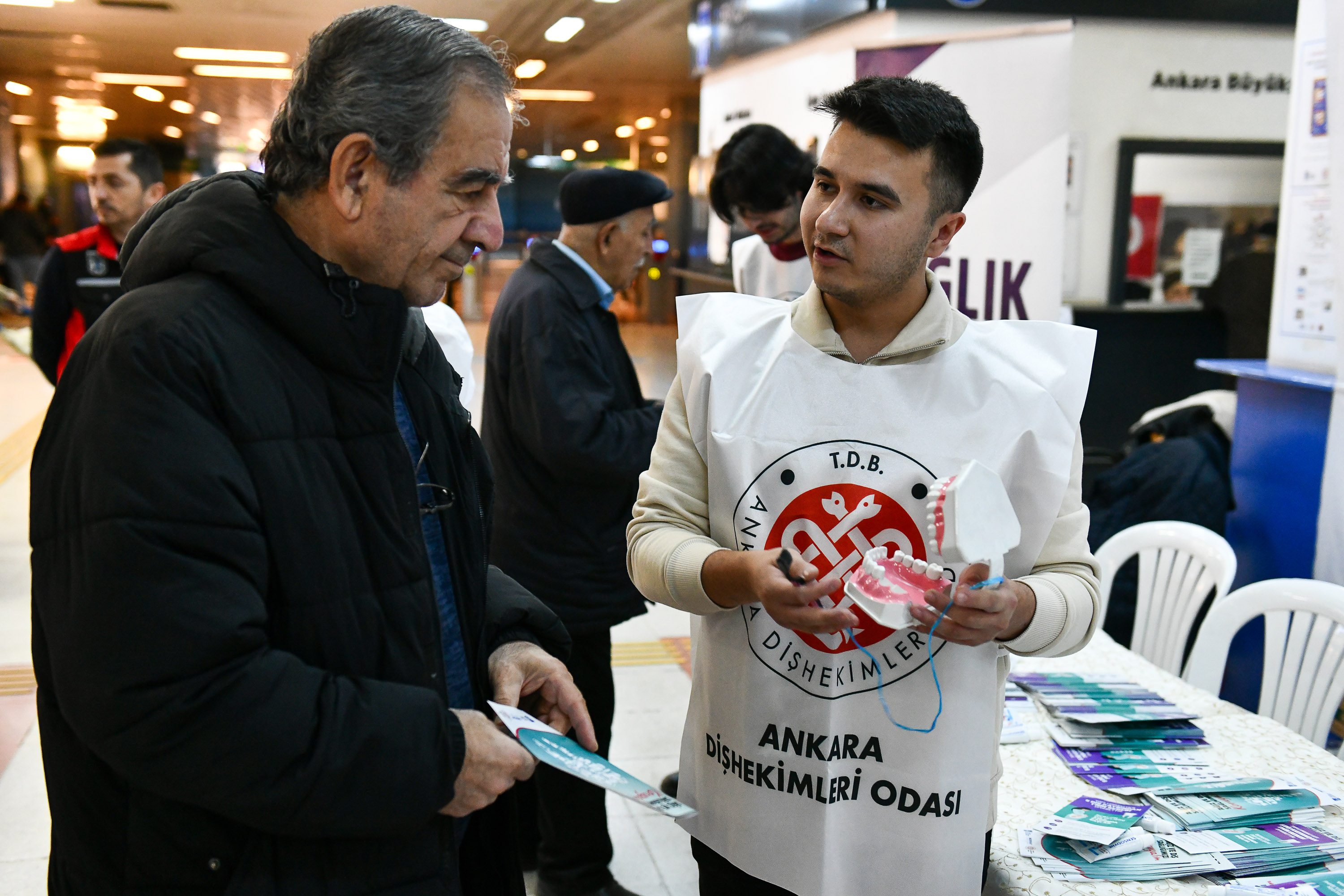 Ankara Büyükşehir Belediyesi Sağlık İşleri Daire Başkanlığı ve Ankara Diş Hekimleri Odası iş birliğiyle “Toplum Ağız Diş Sağlığı Haftası” kapsamında vatandaşları ağız ve diş sağlığı konusunda bilinçlendirmek amacıyla Kızılay Metro İstasyonu’nda broşür ve diş macunu dağıtıldı.