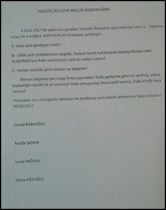 HDP Haliliye Belediye Meclis Üyeleri, 2017 şubat ayı ilk meclis toplantısında meclise soru önergesi verdi. Önergede, temizlik ihalesinin neden Albayraklar firmasına neden verildiği soruldu. Cemal Babaoğlu,Leyla Dağhan,Sema Aişeoğlu,Nadile Şaşkın’ın imzalarının yer aldığı önergede şöyle denildi: