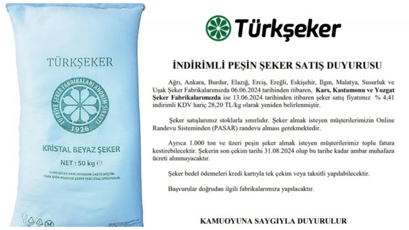 Türkşeker, şeker satış fiyatlarında 16 Temmuz 2024 tarihinden itibaren geçerli olmak üzere indirime gidiyor.
