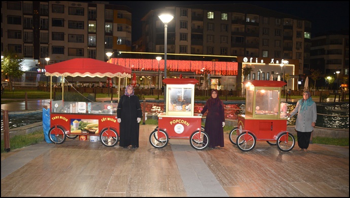 Bu kadınlar, akşam saatlerinde ziyaretçi akınına uğrayan parkta belediye tarafından tahsis edilen araçlarda süt mısır, patlamış mısır, pamuk şeker ve cici bici gibi ürünler satıyor.