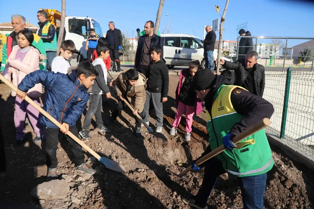 Karaköprü Belediyesinin başlattığı ağaçlandırma kampanyası kapsamında ilçedeki okul bahçelerinde öğrencilerle birlikte fidan dikim etkinlikleri gerçekleştiriliyor
