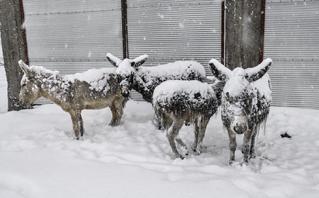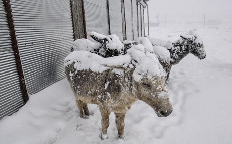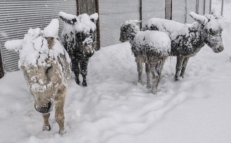 Urfa'nın Siverek ilçesinde kırsal alana terk edilen eşeklerin, kar yağışı ve soğuk hava nedeniyle üzerleri buz tabakasıyla kaplandı.