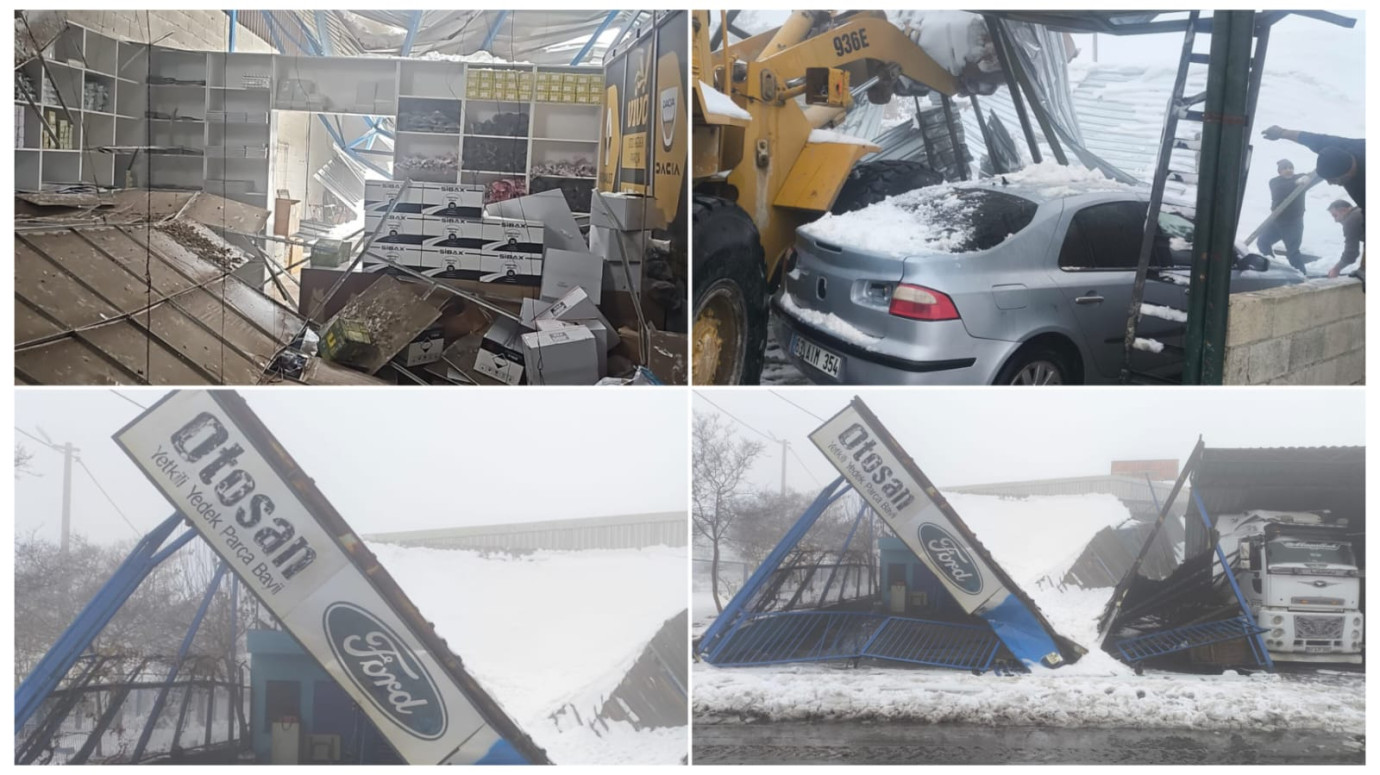 Şanlıurfa’da etkili olan yoğun kar yağışı ve aşırı kar yükü nedeniyle Evren Sanayi Sitesi’nde yaklaşık 30 iş yerinin çatısı çöktü. Çöken çatılar altında kalan çok sayıda araç kullanılamaz hale gelirken, esnaf yaşanan olayın afet kapsamında değerlendirilmesini istedi.