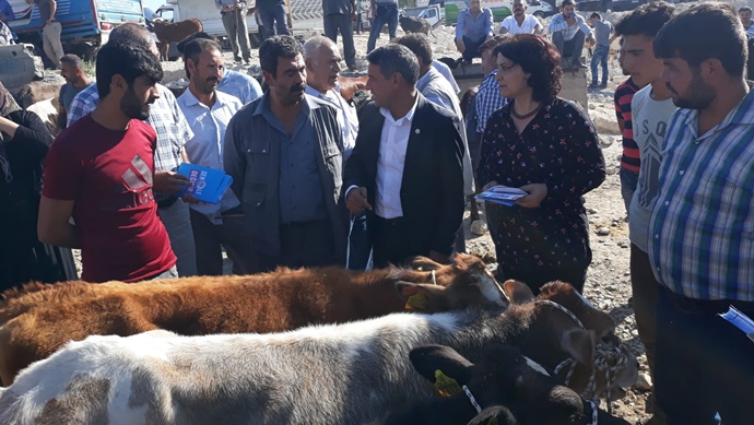 HDP adayları İsmail Kaplan ve Aliye Kızıldamar, sabahın erken saatlerinde Birecik Hayvan Pazarı'nı ziyaret edip destek istediler. Burada hayvancılık yapan köylüler, hayvancılığın öldürüldüğünü, köylü perişan olduğunu söylerken, HDP'liler atmosferin 24 Haziran'da değişeceğini belirttiler.