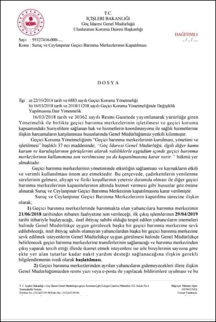 Şanlurfa’nın Ceylanpınar ve Suruç ilçesindeki Suriyeli sığınmacıların barındığı Konaklama Tesislerinin kapatılacağı bildirildi.