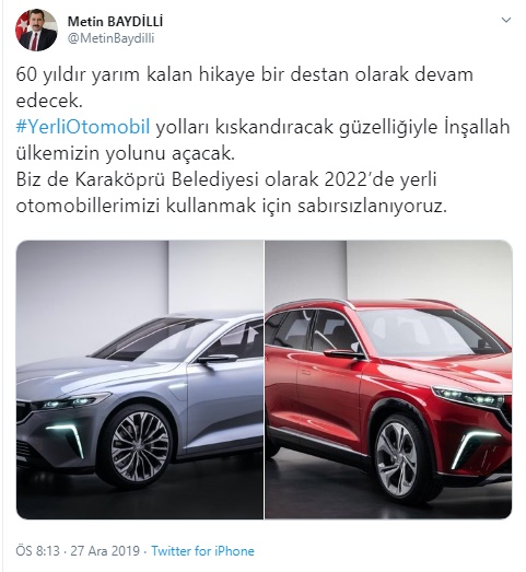 Yerli otomobilin ilgili sosyal medya hesabından değerlendirmelerde bulunan Karaköprü belediye başkanı Metin Baydilli, Cumhurbaşkanı Recep Tayyip Erdoğan'a teşekkür ederek yerli ve milli otomobille gururlandıklarını belirtti.
