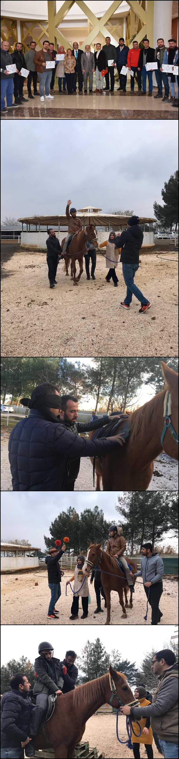 Harran Üniversitesi Binicilik Tesisleri’nde zihinsel ve fiziksel engellilere yönelik terapi eğitimini kapsayan kursta, başarılı olan kursiyerlere Harran Üniversitesi Rektörü Prof.Dr. Mehmet Sabri Çelik tarafından Osmanbey Yerleşkesi Rektörlük makamında yapılan bir törenle sertifikaları verildi.