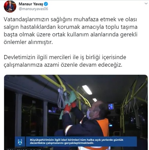 Ankara Büyükşehir Belediyesi Başkanı Mansur Yavaş, twitter hesabından paylaştığı bir video ile koronavirüs (Kovid-19) salgınına karşı önlem çalışmalarına başladığını duyurdu.