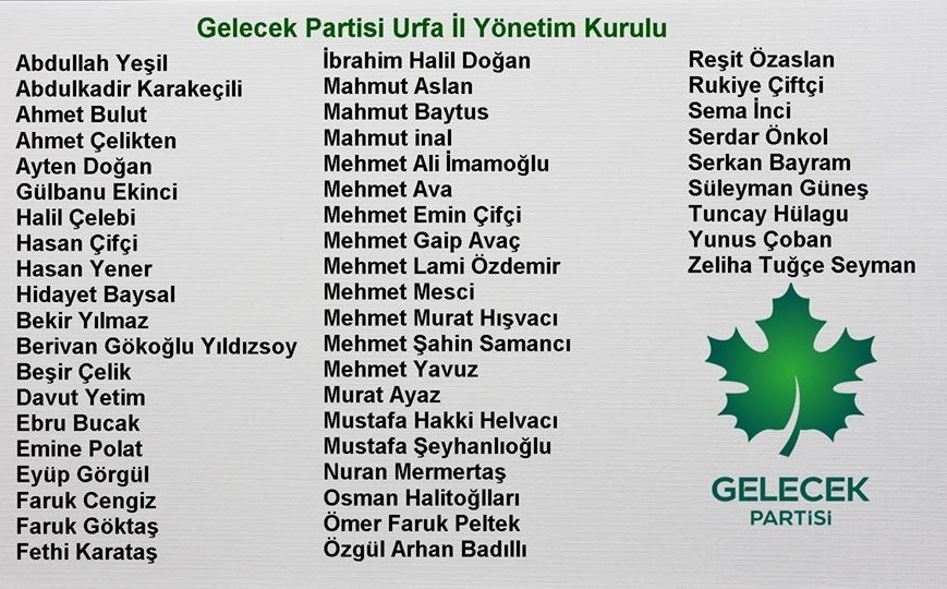 Ahmet Davutoğlu'nun Genel Başkanı olduğu Gelecek Partisi'nde Şanlıurfa İl Yönetim Kurulu üyeleri belli oldu.