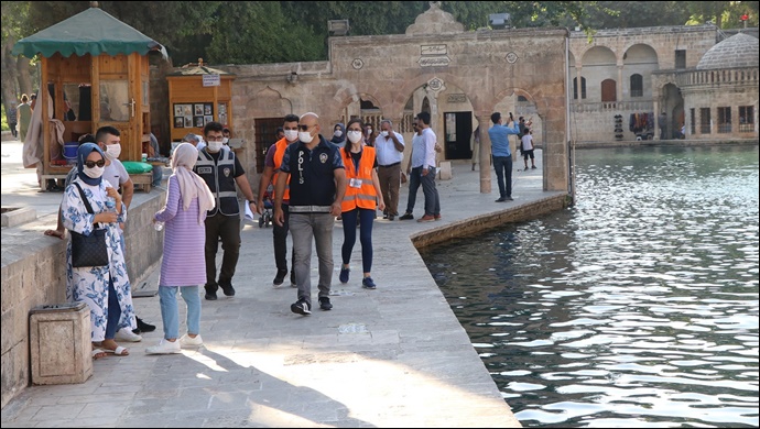 Halkın toplu halde ve yoğun bulundukları noktalara odaklanan denetimlere, Şanlıurfa Emniyet Müdürlüğü de drone ile destek verdi. Şanlıurfa’nın kalbi konumunda olan Halilürrahman Gölü çevresi ve tarihi çarşılar bölgesinde drone ile maske ve fiziki mesafe denetimlerinde kuralları ihlal ettiği belirlenenlere uyarılarda bulunuldu.