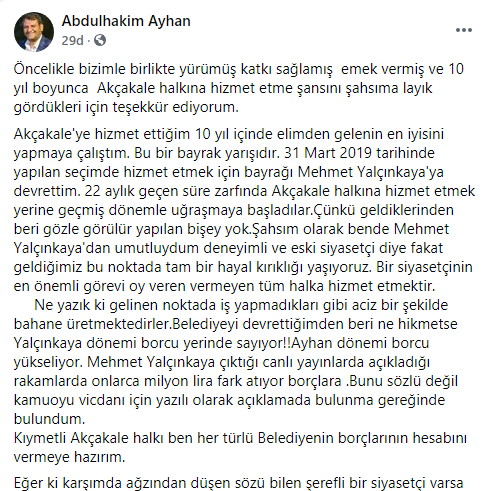 Akçakale önceki dönem Belediye Başkanı Abdülhakim Ayhan, sosyal medya hesabından bir açıklama yayınladı.