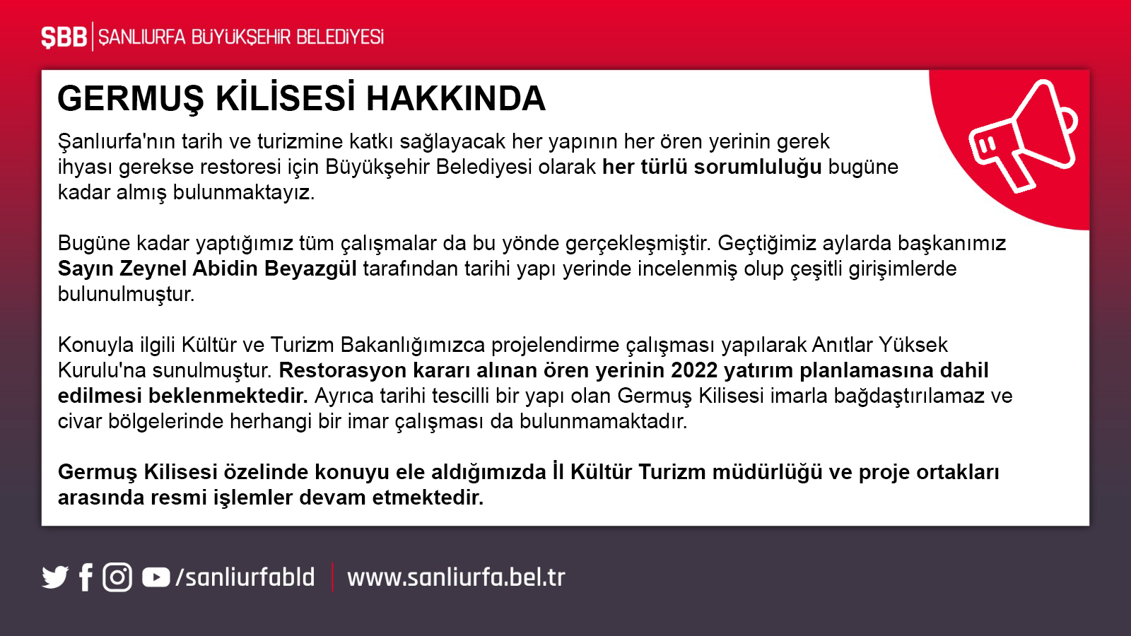 Büyükşehir'den yapılan açıklamada,''Şanlıurfa'nın tarih ve turizmine katkı sağlayacak her yapının her ören yerinin gerek ihyası gerekse restoresi için Büyükşehir Belediyesi olarak her türlü sorumluluğu bugüne kadar almış bulunmaktayız.