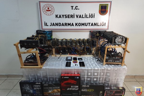 ''Kayseri İl Jandarma Komutanlığınca kripto para üretimi yaptığı tespit edilen şahıslara Melikgazi'de yapılan operasyonda, 3 gümrük kaçağı kripto para üretim cihazı, 3 anakart, 22 ekran kartı, 3 işlemci ve çok sayıda suç unsuru malzeme ele geçirilerek 1 şüpheli yakalanmıştır.''