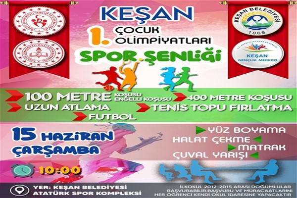 Keşan Belediyesi, Keşan İlçe Milli Eğitim Müdürlüğü, Keşan İlçe Gençlik ve Spor Müdürlüğü ve Keşan Gençlik Merkezi işbirliğinde, 15 Haziran 2022 Çarşamba günü, Keşan 1. Çocuk Olimpiyatları Spor Şenliği gerçekleştirilecek.