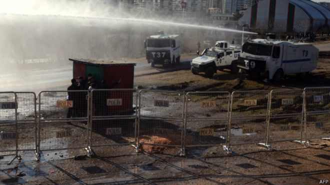 Kalabalıktan birkaç çocuk polise taş atınca TOMA'lar harekete geçiyor.