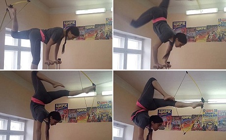 Görüntülerde genç Anna, iki eliyle amuda kalkarak sadece ayaklarını kullanarak yayı geriyor ve birkaç metre ötede bulunan hedefe tam isabet atışını yapıyor.