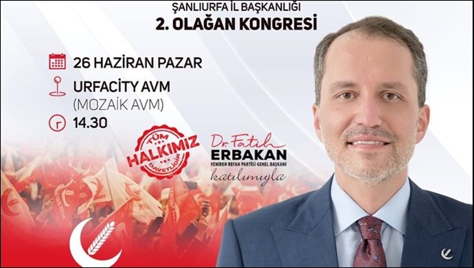 Şanlıurfa 2. Olağan kongresine katılmak üzere ilimize gelecek olan Yeniden Refah Partisi Genel Başkanı Dr. Fatih Erbakan 26 Haziran Pazar günü Şanlıurfa'ya glecek. Genel Başkan Erbakan pazar günü saat 14:30'da UrfaCity AVM Konferans Salonu'unda Şanlıurfa İl Kongresine katılacak.