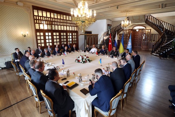 "Ukrayna limanlarında bekleyen tahıl ve gıda maddelerinin deniz yoluyla emniyetle sevkine ilişkin Türkiye, Rusya Federasyonu ve Ukrayna Savunma Bakanlıkları askeri heyetleri ile Birleşmiş Milletler heyeti arasındaki dörtlü toplantı Kalender Kasrı’nda başladı."